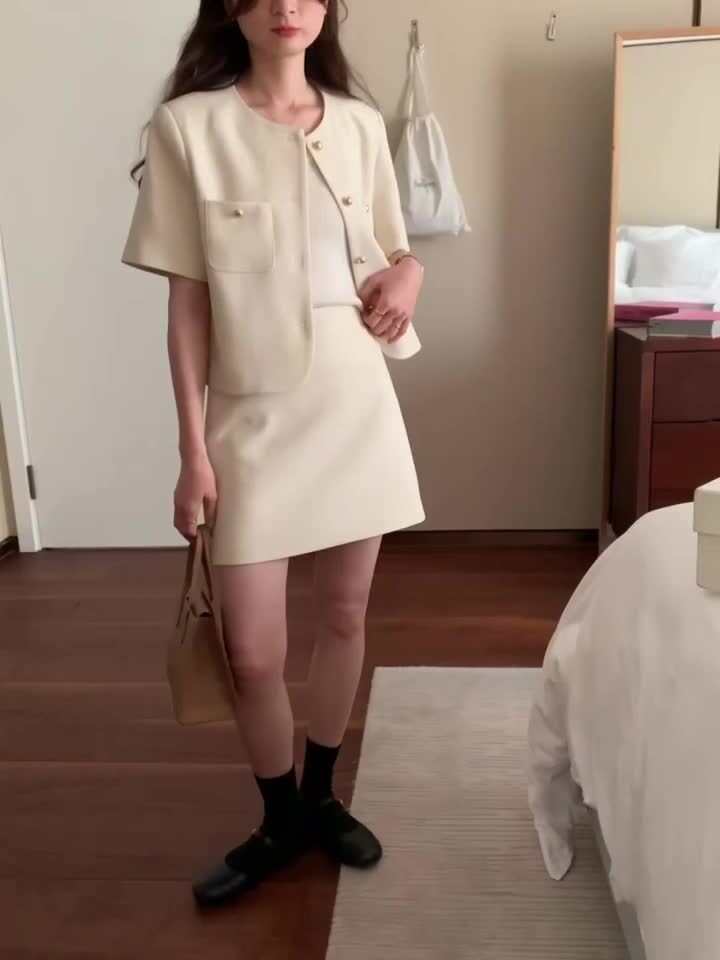 87.韩版2023新款小香风短袖西装套装夏时尚小个子圆领西服短裙两件套